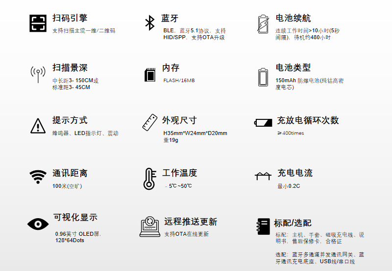 ·150mAh純鈷高密度電池,滿電狀態(tài)10h以上使用,3萬次掃描